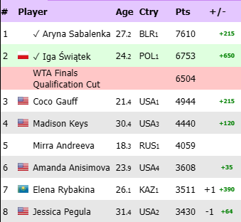 Вище за всіх з українок знаходиться Еліна Світоліна – вона десята. На її рахунку 2596 очок, а у дев'ятої Паоліні (до результату фіналу Цинциннаті) – 3396.