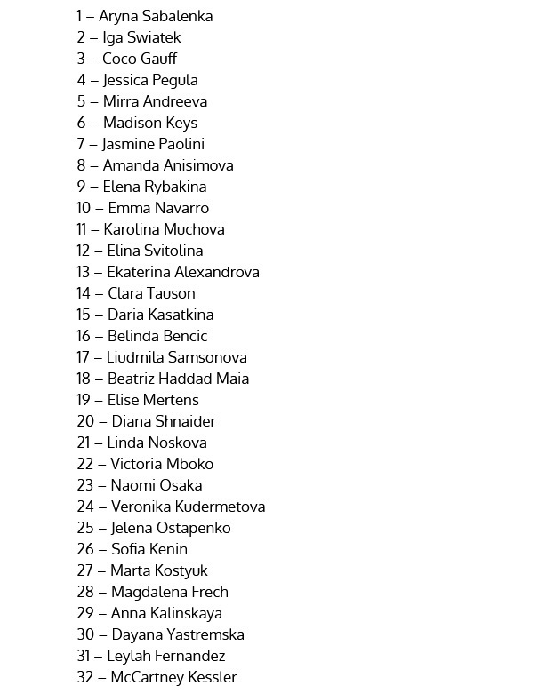 Своїх суперниць дізнаються і українські тенісистки: Еліна Світоліна (WTA 13), Марта Костюк (WTA 29), Даяна Ястремська (WTA 32), Юлія Стародубцева (WTA 66).