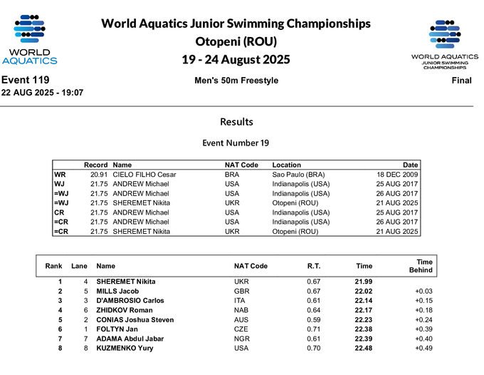 Український плавець Нікіта Шеремет здобув золоту медаль на дистанції 50 м вільним стилем на юніорському чемпіонаті світу, який проходить у румунському Отопені.