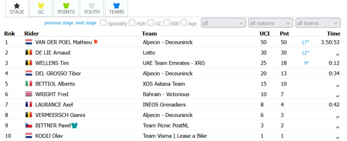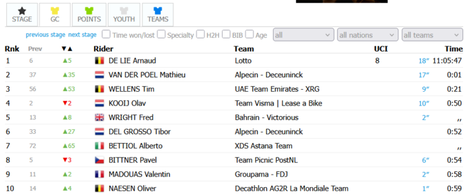 Лідером генеральної класифікації став Арно де Льє. Матьє ван дер Пул відстає на секунду.