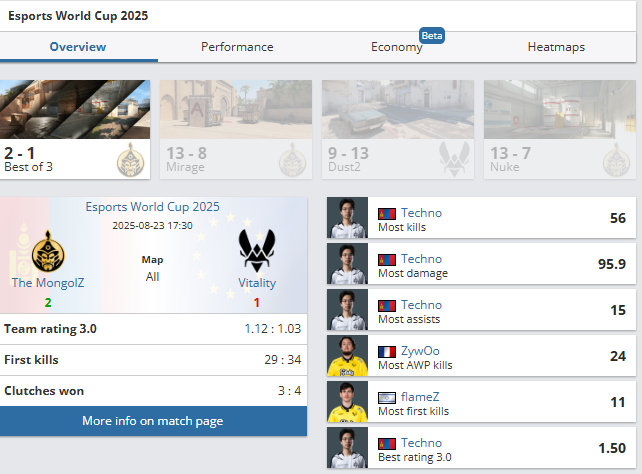 На Nuke The MongolZ провели справжній майстер-клас. Содбаяр «Techno» Мункболд домінував у кожному раунді, а команда повела 9:0, залишивши суперника без шансів. Vitality змогли взяти лише дві половинні, але після програного пістолета і наступного конверсійного раунду їхні надії розбилися остаточно.