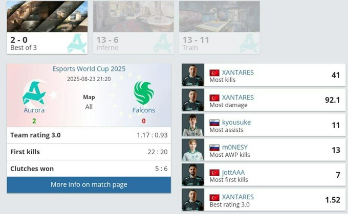 Aurora вийшла до гранд-фіналу Esports World Cup 2025, здолавши фаворитів трибун – Falcons – з рахунком 2:0.