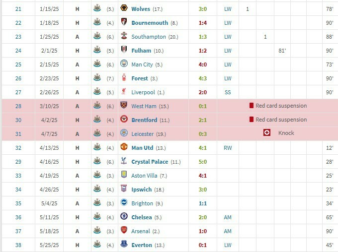 За цей період Гордон у Прем'єр-лізі відзначився лише однією результативною передачею проти «Саутгемптона» (3:1). Востаннє англієць забив гол у змаганні 15 січня 2025 року проти «Вулвергемптона» (3:0).