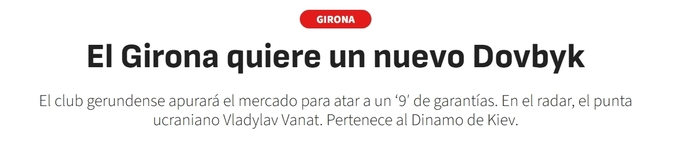 Популярний іспанський ресурс AS новину про інтерес Жирони до форварда Динамо Владислава Ваната подав з заголовком «Жирона хоче нового Довбика».