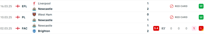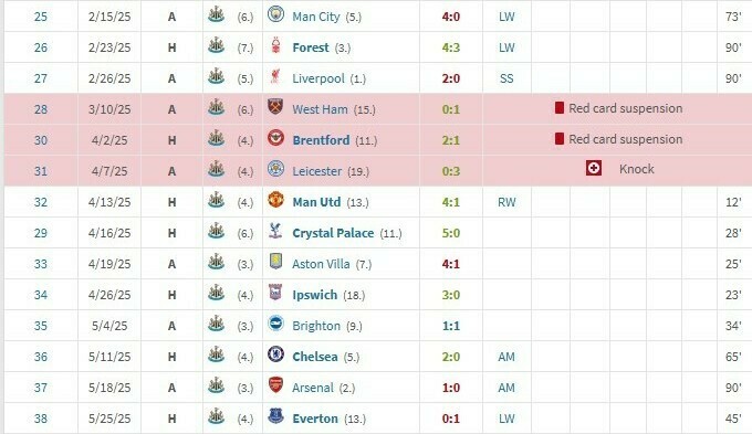 Вінгер «Ньюкасла» Ентоні Гордон, який останнім часом грає на позиції форварда, був видалений в останній грі та продовжив свою серію без результативних дій на клубному рівні до 14 матчів.