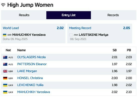 Стрибки у висоту. Жінки. Стартовий лист