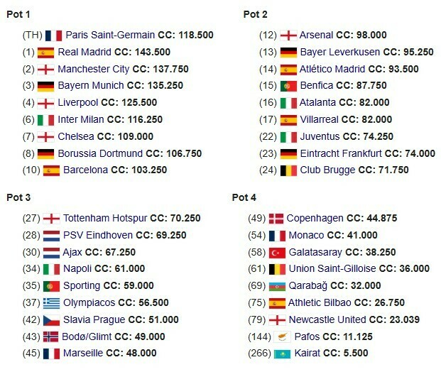 🔹 Кошик 1: ПСЖ (Франція), Реал Мадрид (Іспанія), Манчестер Сіті (Англія), Баварія (Німеччина), Ліверпуль (Англія), Інтер (Італія), Челсі (Англія), Боруссія Дортмунд (Німеччина), Барселона (Іспанія)