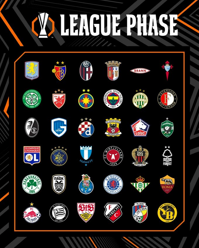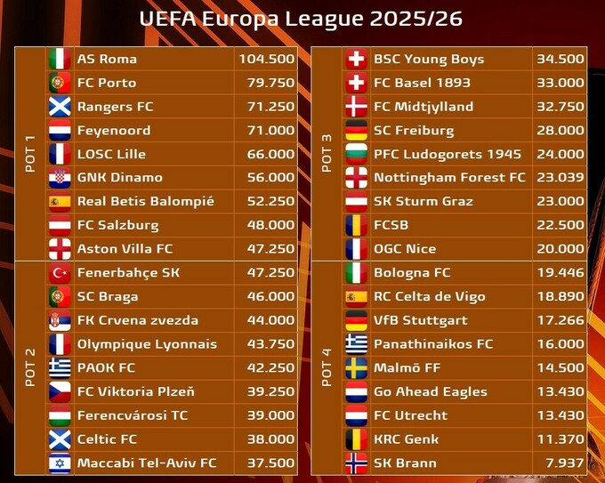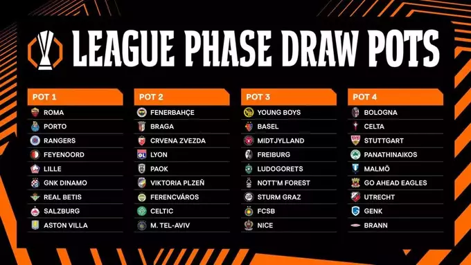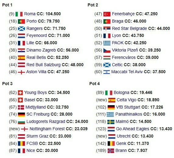 🔹 Кошик 1: Рома (Італія), Порту (Португалія), Рейнджерс (Шотландія), Феєнорд (Нідерланди), Лілль (Франція), Динамо Загреб (Хорватія), Бетіс (Іспанія), РБ Зальцбург (Австрія), Астон Вілла (Англія)