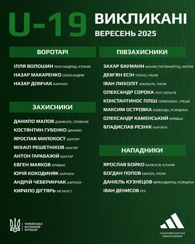 Воротарі: Назар Домчак («Карпати» Львів), Назар Макаренко («Олександрія»), Ілля Волошин («Реал», Іспанія).