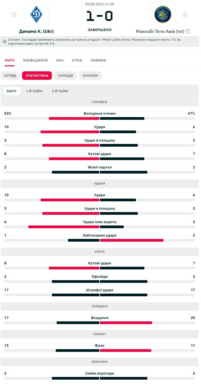 Брак ударів та гірка перемога. Статистика матчу Динамо – Маккабі