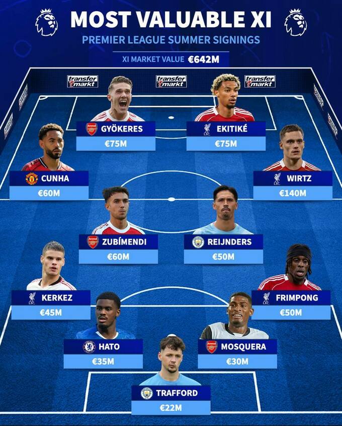 - Нападники: Матеус Кунья (Манчестер Юнайтед) – €60 млн, Флоріан Вірц (Ліверпуль) – €140 млн, Віктор Дьокереш (Арсенал) – €75 млн, Уго Екітіке (Ліверпуль) – €75 млн