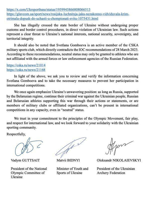 Національний олімпійський комітет України, Міністерство молоді та спорту України та Українська федерація стрільби з лука звернулися до президентки МОК Кірсті Ковентрі та президента Міжнародної федерації стрільби з лука Угура Ерденера.