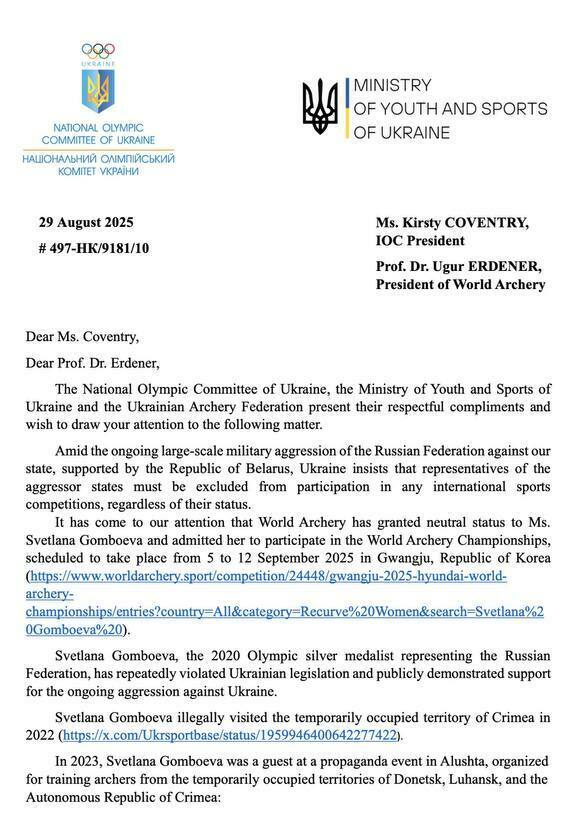 Надіслана вимога переглянути рішення про допуск росіянки світлани гомбоєвої до чемпіонату світу зі стрільби з лука, що відбудеться 5–12 вересня 2025 року у Кванджу (Південна Корея).