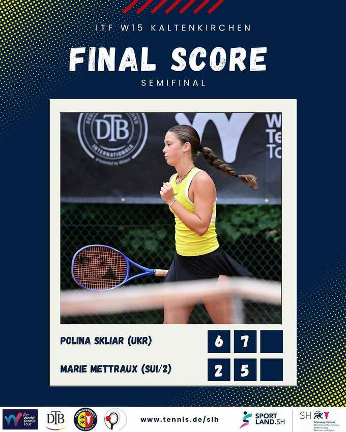 14-річна українська тенісистка Поліна Скляр пробилася до фіналу грунтового турніру ITF W15 у німецькому місті Кальтенкірхен.