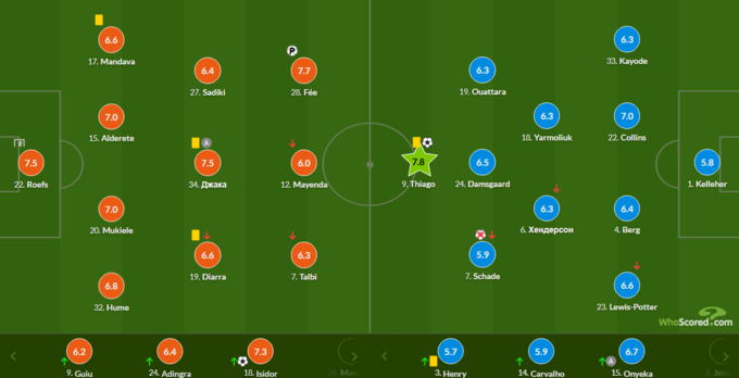 Кращим гравцем матчу за версією обох порталів став бразильський нападник «бджіл» Ігор Тіаго. Він провів на полі весь матч і відзначився одним голом, а також отримав оцінки 7,9 і 7,8.