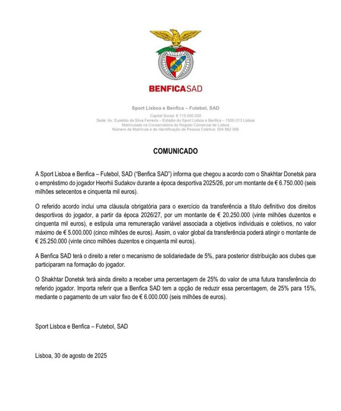 «Шахтар» отримає 25% від майбутнього продажу Судакова, проте португальський клуб матиме можливість зменшити цей відсоток до 15%, виплативши фіксовану суму в розмірі 6 млн євро.