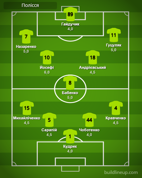 «Полісся»: Кудрик – Михайліченко (Корнійчук, 58), Сарапій (Бескоровайний, 65), Чоботенко, Кравченко – Йосефі (Таллес Коста, 58), Бабенко, Андрієвський – Назаренко (Філіппов, 73), Гайдучик (Велетень, 58), Гуцуляк.
