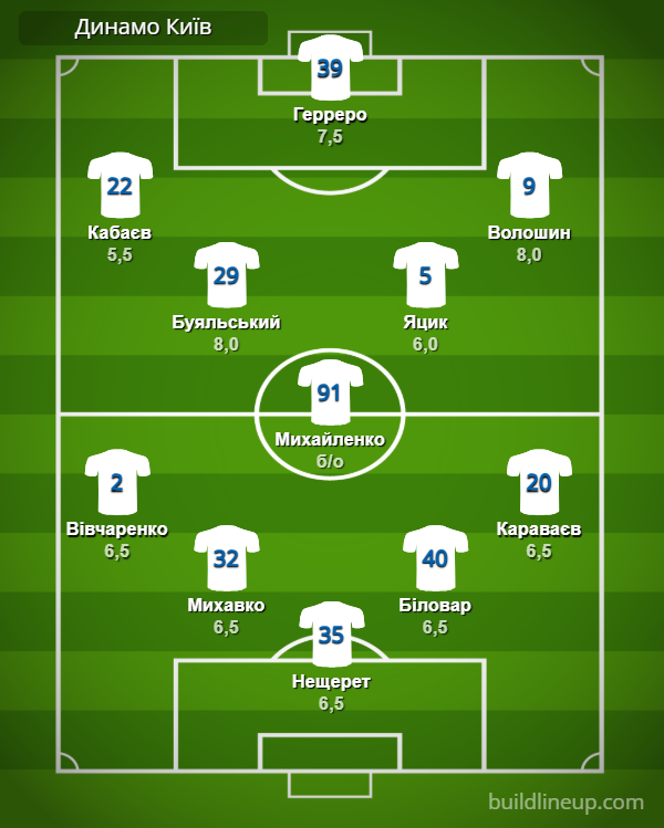 «Динамо» Київ: Нещерет – Вівчаренко, Михавко, Біловар, Караваєв (Дубінчак, 80) – Буяльський (Піхальонок, 80), Михайленко (Бражко, 9), Яцик – Кабаєв (Ярмоленко, 71), Герреро (Пономаренко, 71), Волошин.