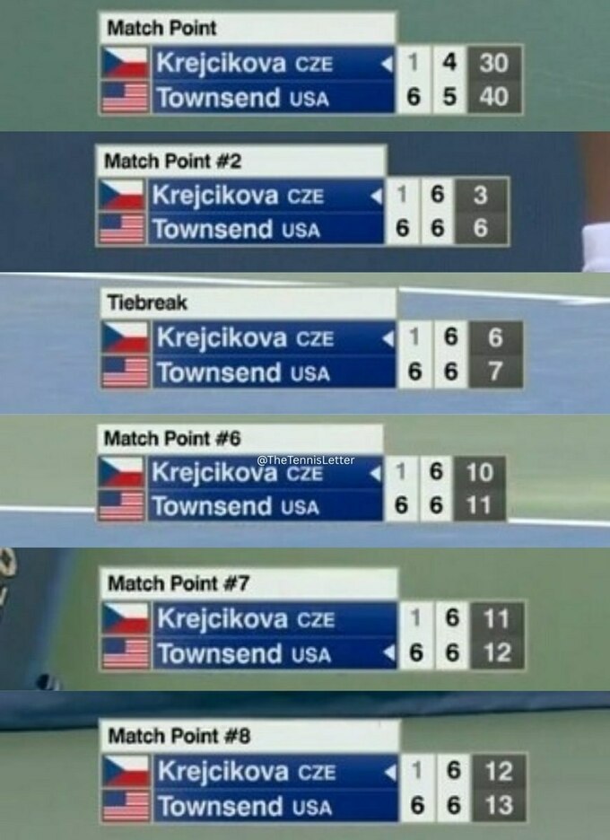 У другій партії Барбора врятувала аж вісім матчболів: один на подачі в 10-му геймі і ще сім на тай-брейку, зокрема чеська тенісистка відіграла з 3:6!