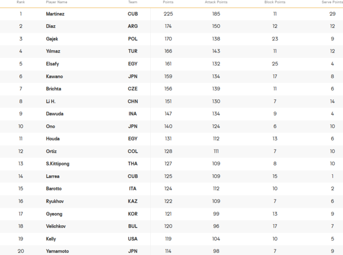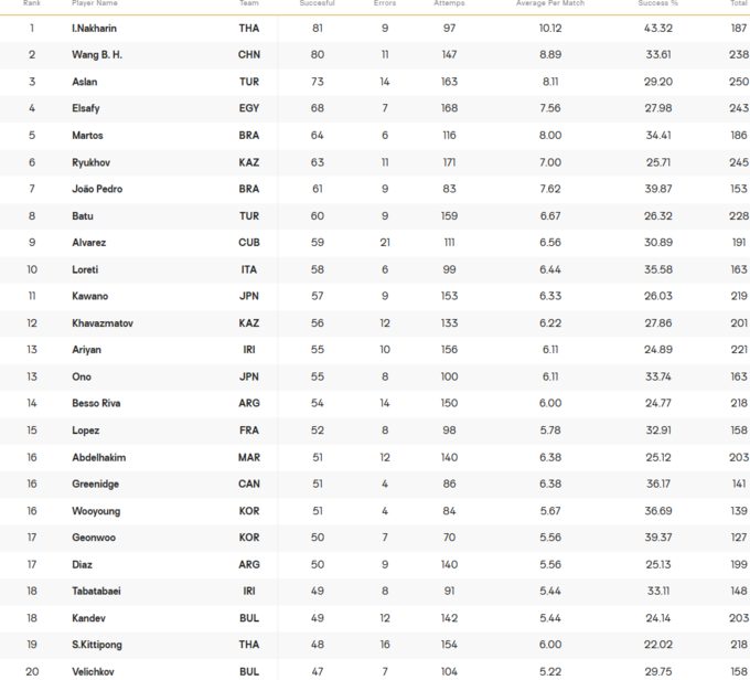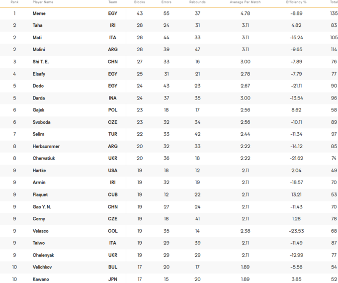 Найкращий серед українців – Руслан Черватюк, який посів 8-ме місце з 20 результативними діями на блоці. Андрій Челеняк, який став найкращим блокуючим першого туру групового етапу, зайняв 9-те місце з 19 блоками.