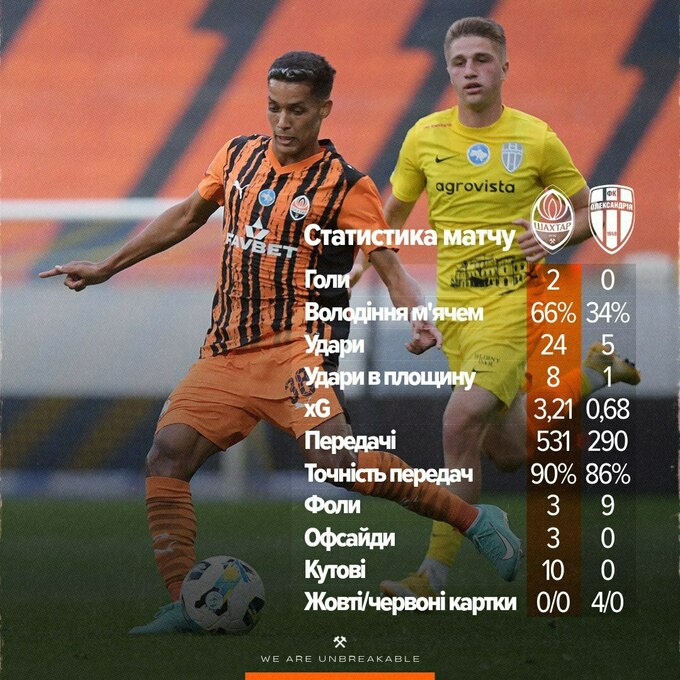 Донецький «Шахтар» в останньому матчі наніс 24 удари по воротах «Олександрії», 8 з яких були у створ, а 2 – результативними.