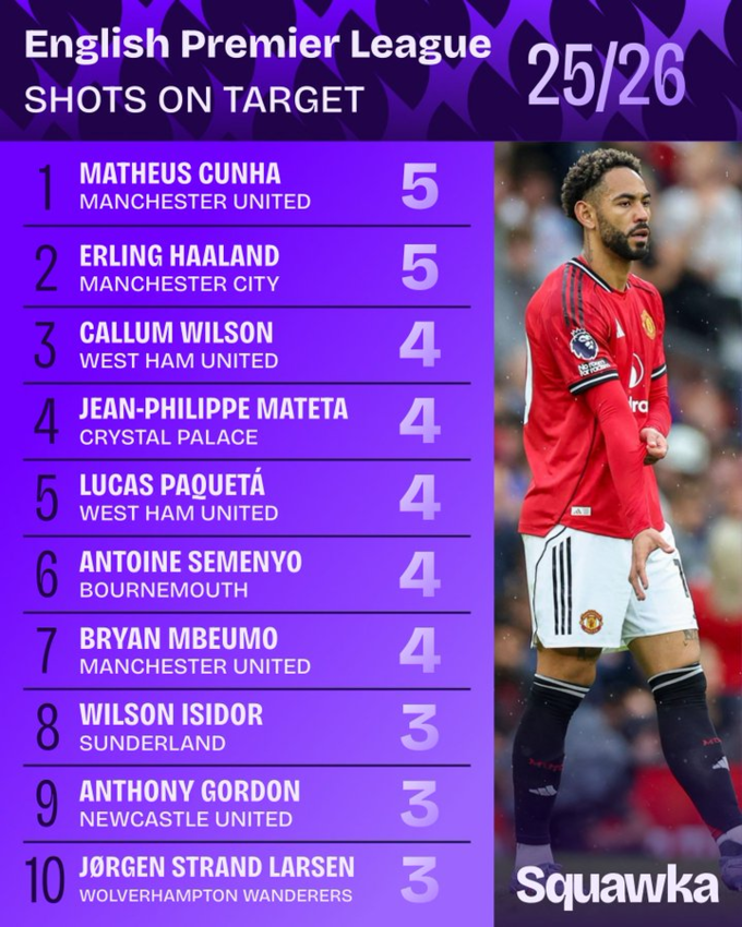Після трьох зіграних турів АПЛ Матеус Кунья та Ерлінг Холанд лідирують за кількістю ударів у площину воріт суперників (по 5).