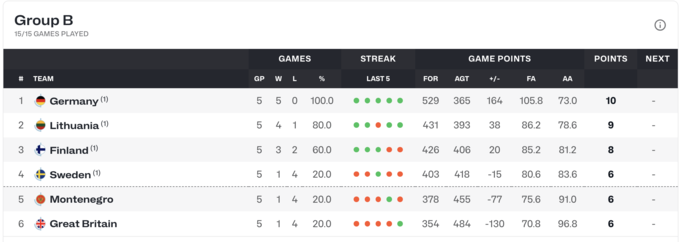 А з групи В далі пройшли Німеччина, Литва, Фінляндія та Швеція.