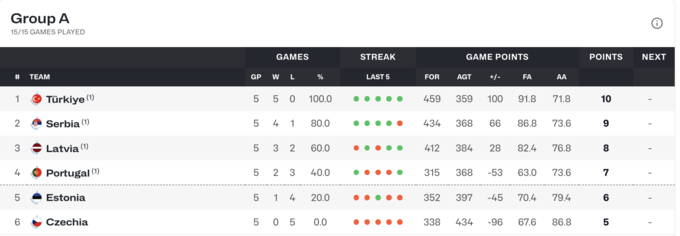 З групи А у 1/8 фіналу пройшли збірні Туреччини, Сербії, Латвії та Португалії.