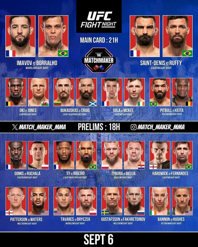 Головною подією стане претендентський 5-раундовий бій в середній вазі (до 83,9 кг) – в октагоні зустрінеться француз Нассурдін Імавов (16–4) і бразилець Кайо Борральо (17–1).