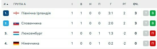 Турнірне становище у групі A: Північна Ірландія, Словаччина (по 3 очки), Люксембург, Німеччина (по 0).