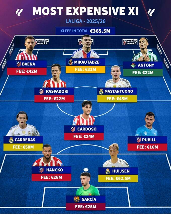 - Нападники: Алехандро Баена (Атлетіко) – €42 млн, Жорж Мікаутадзе (Вільярреал) – €31 млн, Антоні (Бетіс) – €22 млн