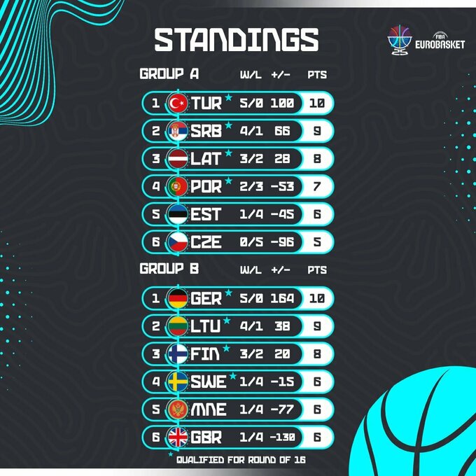Підсумкові турнірні таблиці. На Євробаскеті-2025 визначено пари 1/8 фіналу