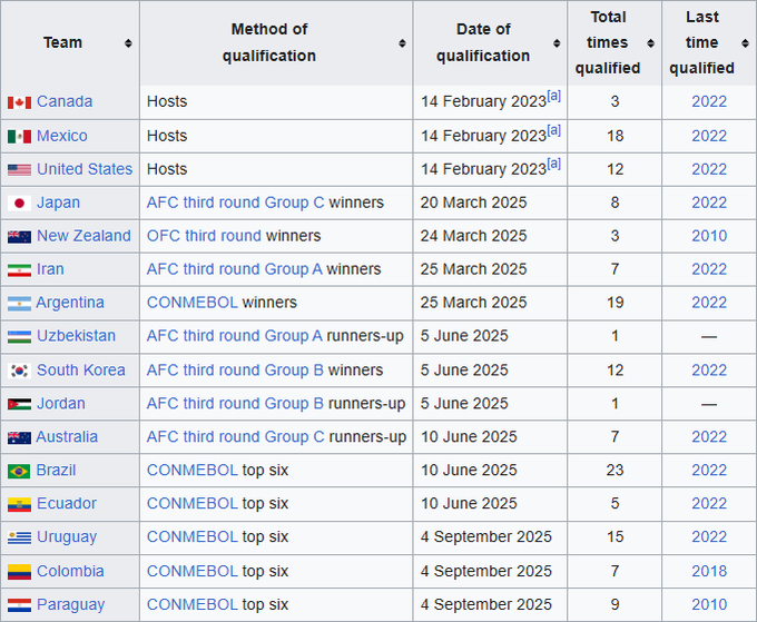 | 3 | Уругвай | 17 | 7 | 6 | 4 | 22 - 12 | 10.09.25 02:30 Чилі - Уругвай05.09.25 Уругвай 3:0 Перу11.06.25 Уругвай 2:0 Венесуела06.06.25 Парагвай 2:0 Уругвай25.03.25 Болівія 0:0 Уругвай22.03.25 Уругвай 0:1 Аргентина | 27 | |