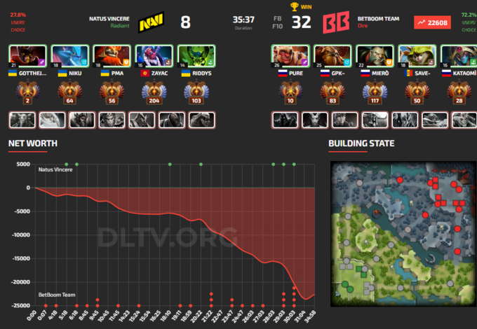 У першій карті у NAVI взагалі нічого не склалося зі стадії лайнінгу і вони програли без особливих шансів. У другій карті була боротьба, Артем «Niku» Бачкур зміг повернутися на Puck, але bb team показали високий рівень командної гри. Dragon Knight від gpk – його фінальна статистика 15/1/15.