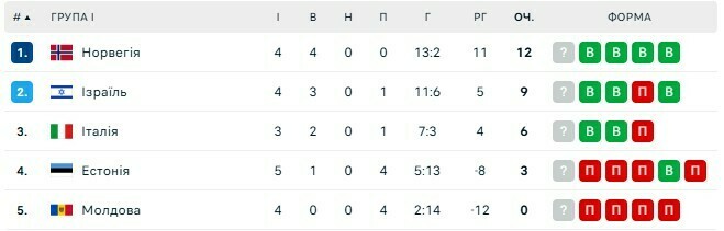 Лідирує у цій групі Норвегія з 4 перемогами (12 очок), далі йдуть Ізраїль (9) та Італія (6).