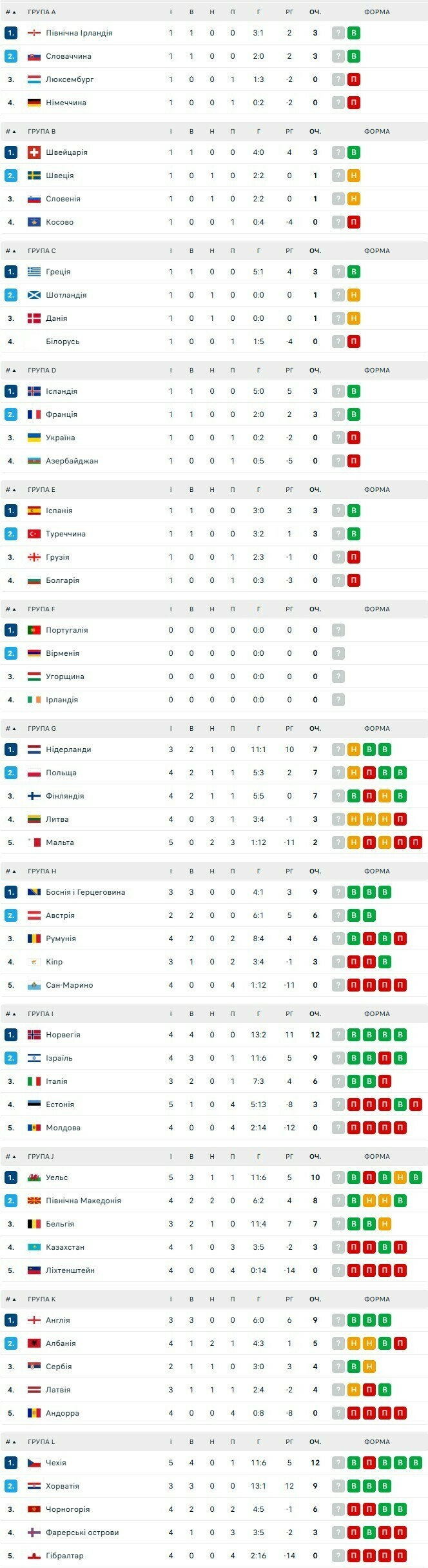 Турнірні таблиці. Підсумки дня кваліфікації ЧС: яке місце посідає Україна