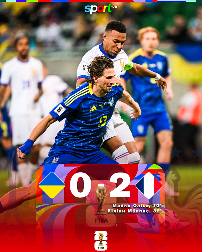 Збірна України у польському Вроцлаві поступилася збірній Франції (0:2). Голи забили Майкл Олісе та Кіліан Мбаппе.