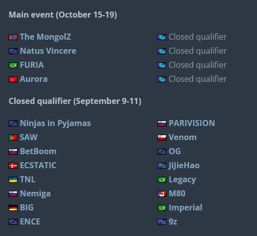 Серед підтверджених учасників кваліфікації також Ninjas in Pyjamas, SAW, BIG, ENCE та український клуб TNL, які змагатимуться онлайн за чотири місця у мейн-івенті з 9 по 11 вересня.