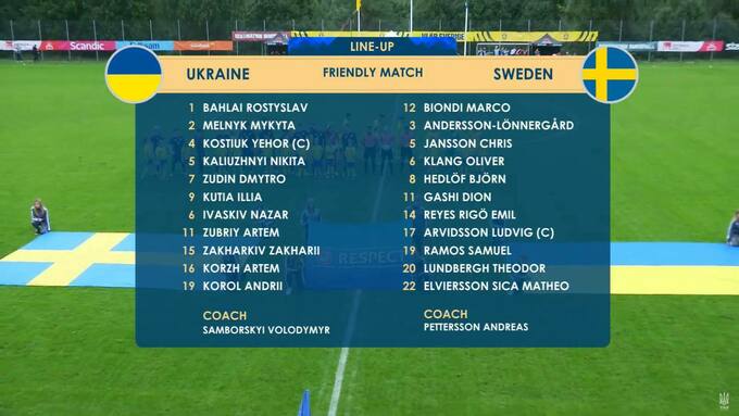 Матч відбувався під дощем на важкому газоні. На 12-й хвилині Дмитро Зудін замкнув розрізну передачу Артема Зубрія ударом головою та відкрив рахунок (1:0). Шведи відповіли кількома гострими випадами, однак надійно діяв воротар Ростислав Баглай. У компенсований час першого тайму Микита Мельник після стандарту підхопив м’яч і фактично закотив його у ворота (2:0).
