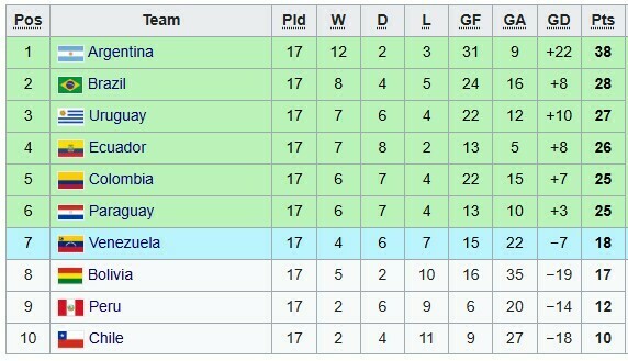Кваліфікація ЧС-2026 (Південна Америка). Турнірна таблиця