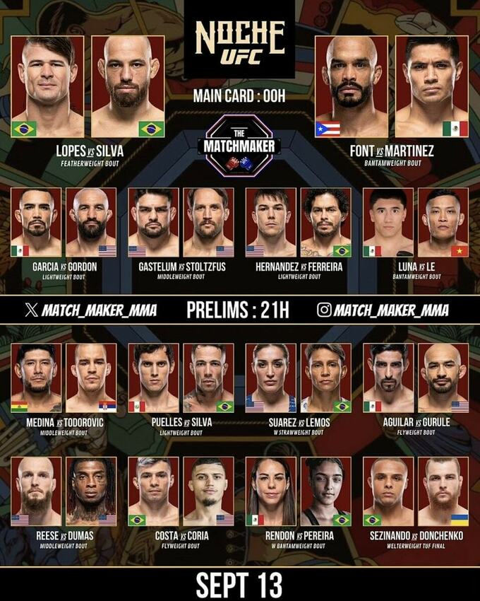 13 вересня на арені «Frost Bank Center» в американському Сан-Антоніо відбудеться турнір зі змішаних єдиноборств UFC Noche.
