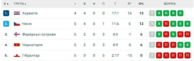 Ситуація у групі: Хорватія, Чехія (по 12), Фарери, Чорногорія (по 6), Гібралтар (0).