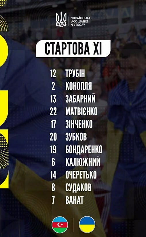 Україна: Трубін – Зінченко (Михайліченко, 84), Матвієнко, Забарний, Конопля – Бондаренко (Волошин, 75), Калюжний (Ярмолюк, 61), Очеретько (Шапаренко, 75) – Судаков, Ванат (Довбик, 61), Зубков.