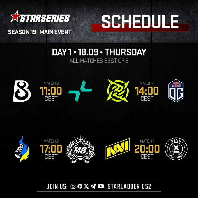 Також у перший ігровий день зіграє NiP з українським снайпером r1nkle, їхнім суперником стане OG. А команда Passion UA, де зараз більшість американських гравців, зустрінеться з Gentle Mates.
