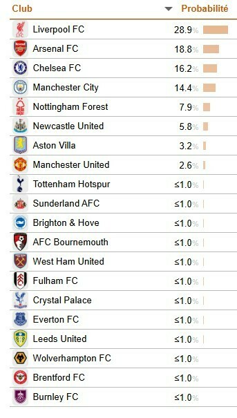 До топ-8 також увійшли Ньюкасл (5,8%), Астон Вілла (3,2%) та Манчестер Юнайтед (2,6%). Для решти клубів шанси на чемпіонство не перевищують 1%.