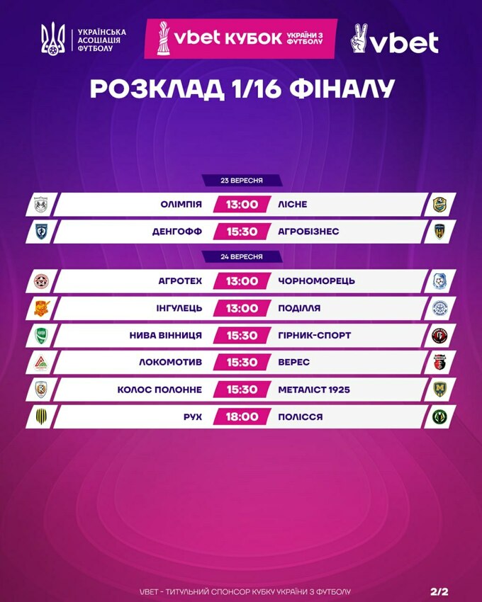Дати та час матчів 1/16 фіналу