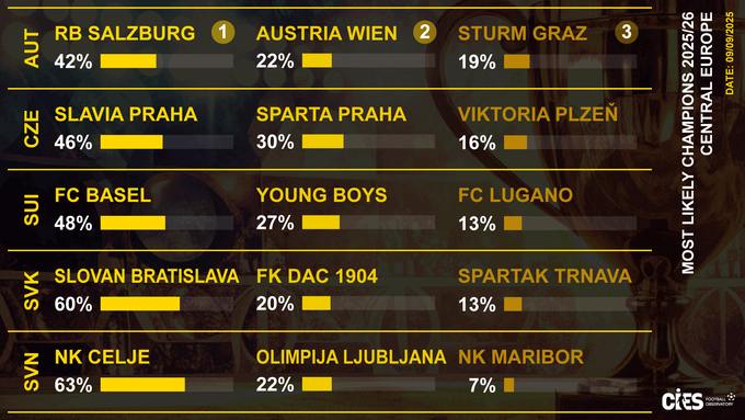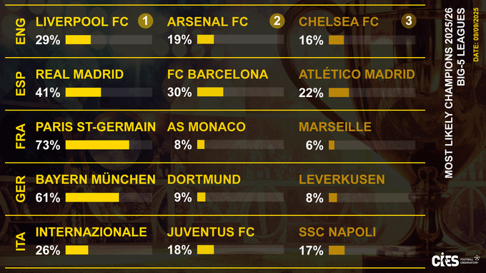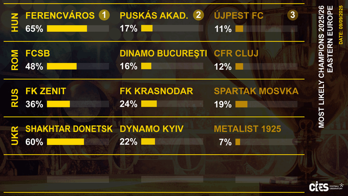 Міжнародний центр спортивних досліджень (CIES Football Observatory) оприлюднив прогноз щодо шансів клубів Української Прем’єр-ліги на чемпіонство в сезоні 2025/26.