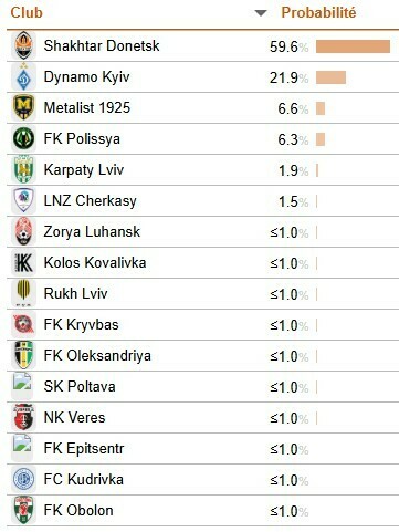 У топ-5 також увійшли Металіст 1925 Харків (6,6%), Полісся Житомир (6,3%) та Карпати Львів (1,9%). Для майже всіх інших клубів шанси на чемпіонство не перевищують 1%.