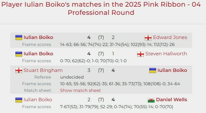 Український снукерист Юліан Бойко прокоментував свій виступ у турнірі Pink Ribbon 2025 в англійському Волсоллі, де він дійшов до чвертьфіналу:
