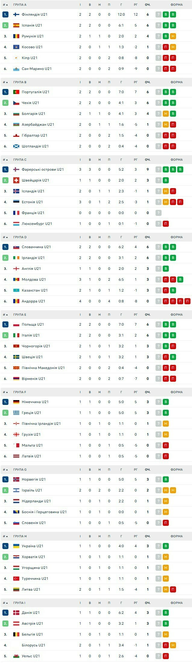 Турнірні таблиці Євро-2027 U-21: Україна лідирує. Далі пауза на місяць